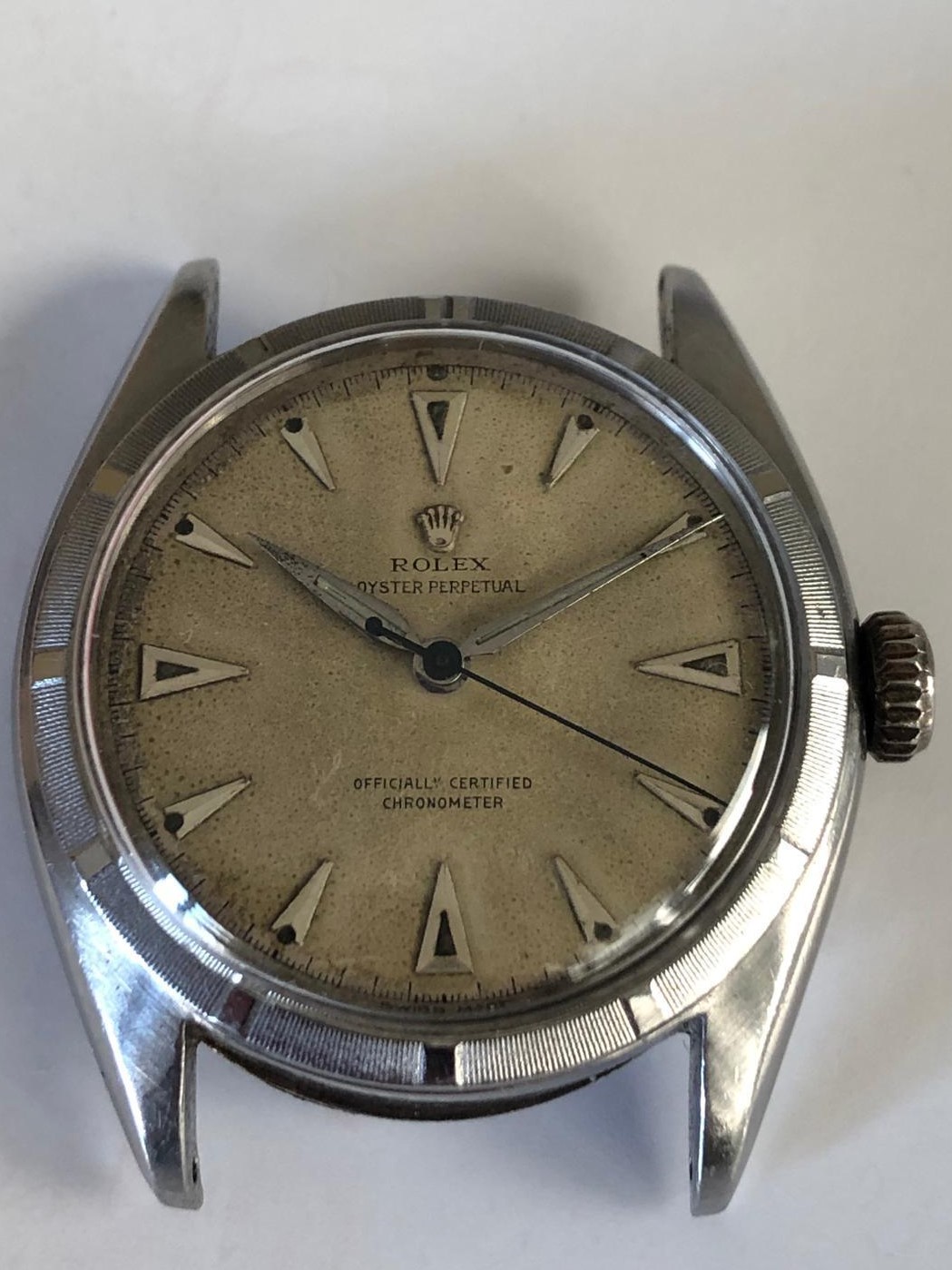 De cursief gedrukte bedragen zijn voor objecten in een andere valuta dan euros en zijn geschatte omrekeningen naar euros op basis van de wisselkoersen van bloomberg. Additionally, the rolex oyster perpetual includes a beautiful aged white dial with gold arrowhead hands and hour markers. Oyster series in the 1950s, so only the movement has some intrinsic value in it. 26 jewel movement, and amazing 14k gold case with engine turned bezel. Speaking of the dial, you can see ghostly shadows of radium burn from the luminous. De cursief gedrukte bedragen zijn voor objecten in een andere valuta dan euros en zijn geschatte omrekeningen naar euros op basis van de wisselkoersen van bloomberg.. 6085 rolex oyster perpetual from circa 1951.